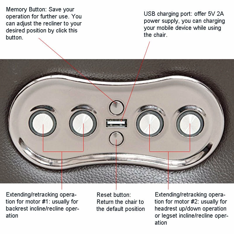 - USB charging port: offer 5V 2A power supply, allows you to recharge your mobile device while using your recliner.