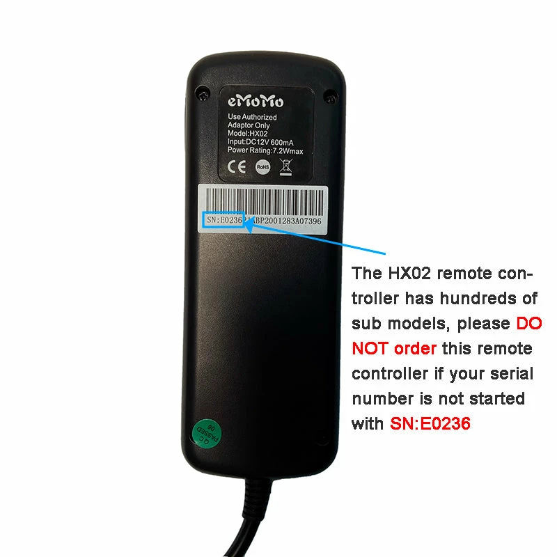 - The eMoMo HX02 remote controller has a lot of subversions, this one can only replace the HX0236 version, please ONLY ORDER this remote controller when your original remote controller’s serial number is starting with “SN:E0236”.