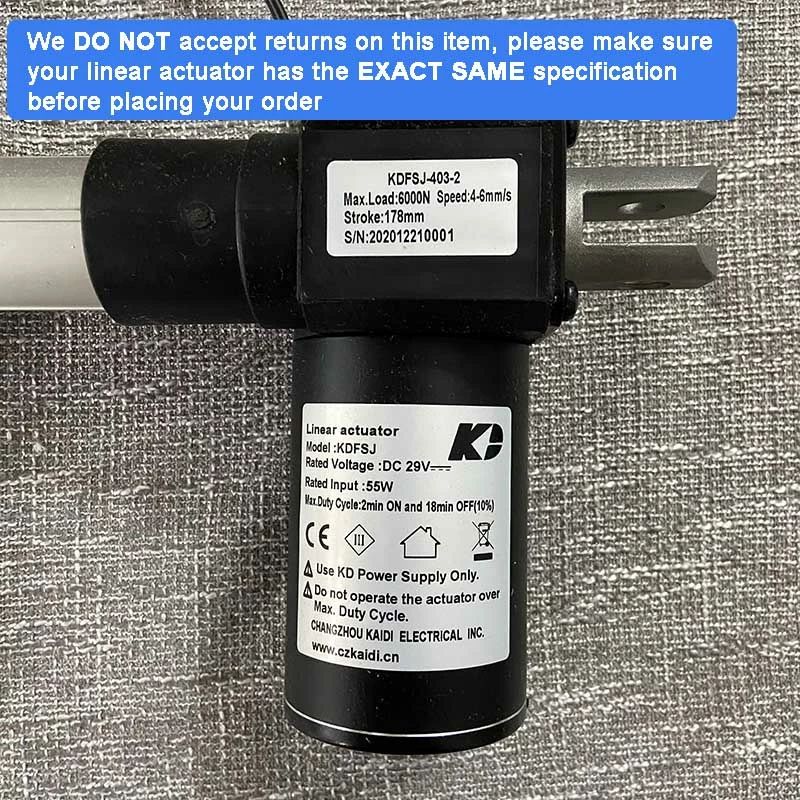 - The item is quite heavy, we DO NOT accept returns. Please check your linear actuator’s label first, and make sure your linear actuator has the EXACT SAME specification before placing your order.