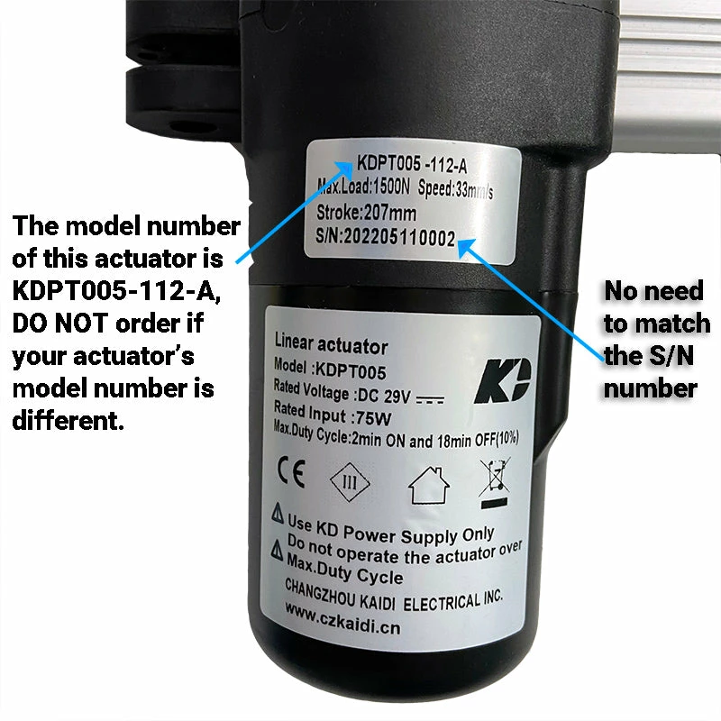 - This actuator is NOT universal, DO NOT ORDER if your linear actuator’s model number is not KDPT005-112-A