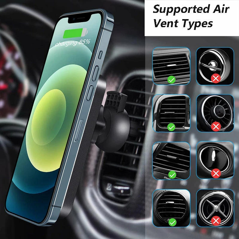 This vent mount phone bracket is specially designed according to the new feature of the iPhone 12 series, it will hold your iPhone firmly with a strong magnet, and charge your phone wirelessly with 15W high power.