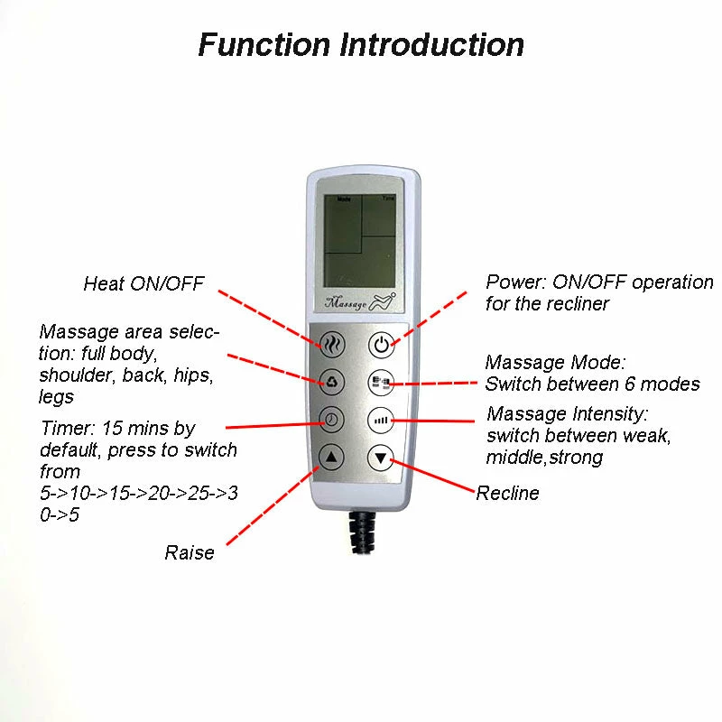 Replacement remote controller for power lift massage chair, if your recliner’s remote controller is damaged, and it has the same design, you can use this remote controller to replace it.Â